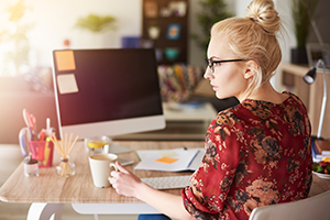 blond woman at office desk holding pen