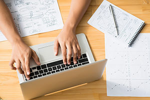 Hands of man using laptop to work on some business project